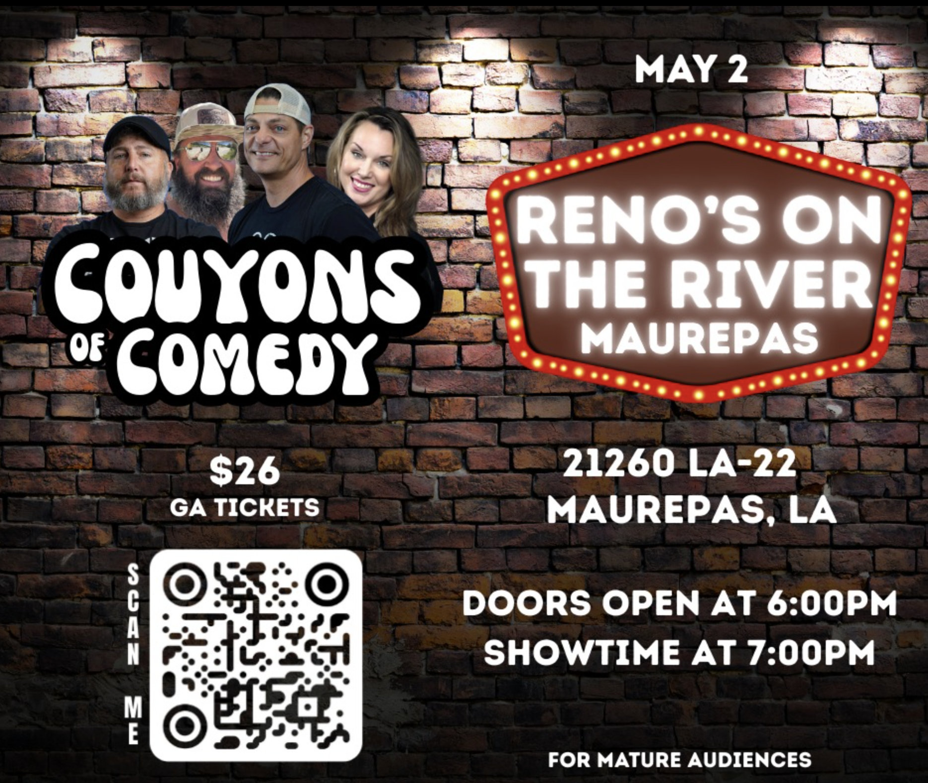 May 1st the Couyons of Comedy are taking over Reno’s on the River and it’s about to be a night full of laughs, drinks, and a little Cajun chaos ???? ???? 21260 LA-22, Maurepas, LA ???? $26 GA Tickets ???? Doors Open: 6PM ???? Showtime: 7PM River views + no-filter comedy = the perfect night out. Tag who’s riding with you!