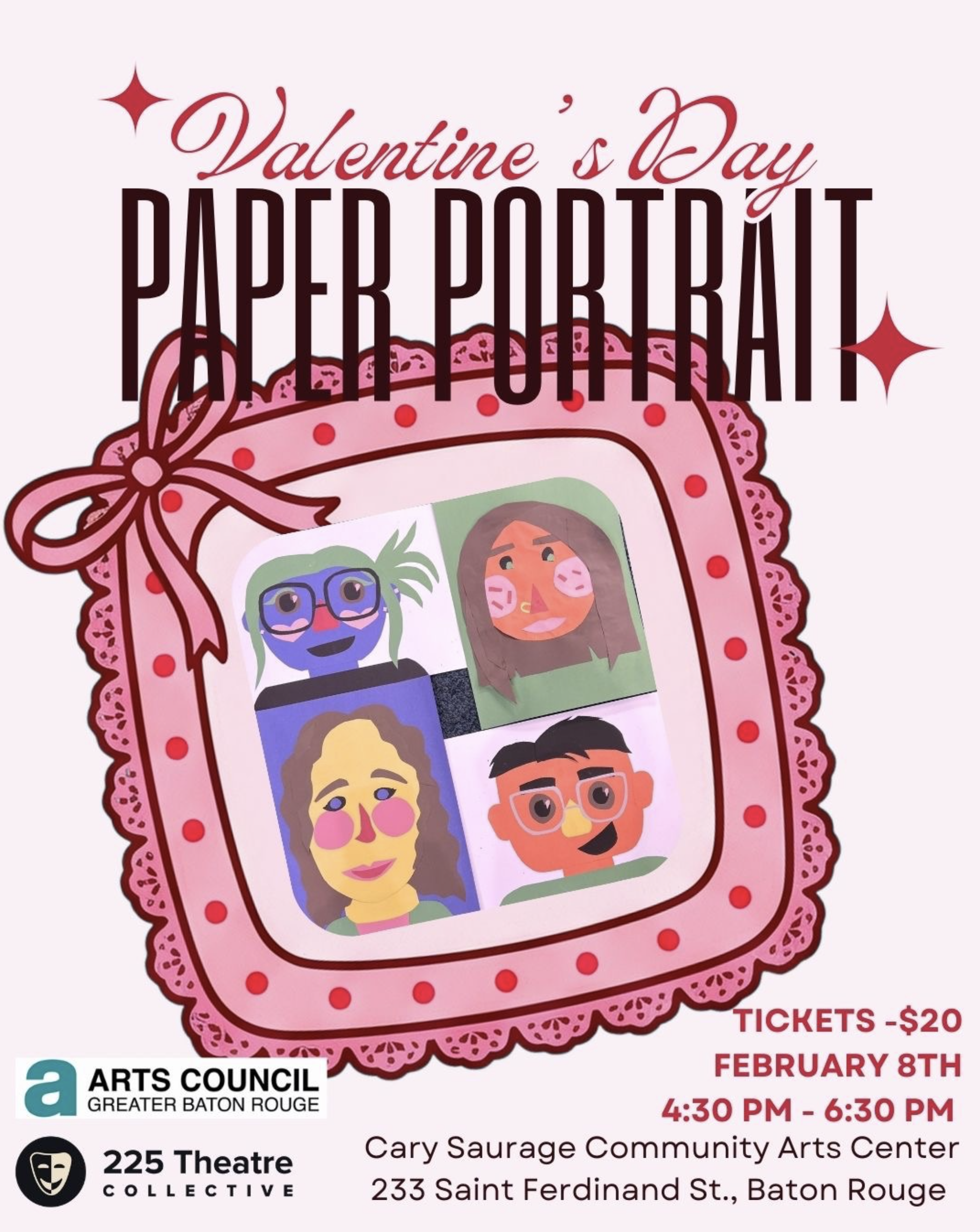 233 St Ferdinand St, Baton RougeLooking for a cute Valentine’s Day activity? Come join us for a crafting night of making paper portraits! This workshop is perfect for couples, best friends, family members, or individuals. You will learn how to use paper to create shapes and designs that reflect a loved one or yourself! Techniques like layout, design, color theory, and more will be taught to you in order to make a one of a kind portrait. All materials are provided with your ticket. This is a family-friendly, inclusive event designed for adults, teens, and children alike. Everyone will leave with a completed paper portrait for themselves or a friend/partner! Register Today! DATE/TIME: Sunday, Feb. 8th | 4:30PM - 6:30PM LOCATION: Cary Saurage Community Arts Center - 233 St Ferdinand St, Baton Rouge, LA 70802 https://www.225theatrecollective.com/.../paper-portraits...