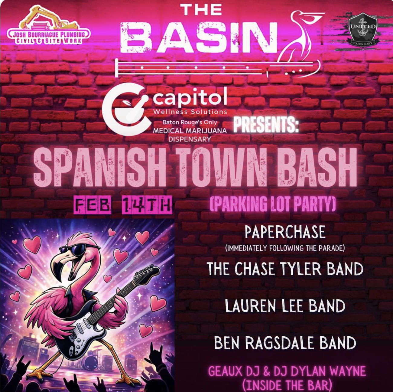 Capitol Wellness Solutions presents the 2026 Spanish Town Bash at The Basin Music Hall! Our live music line up OUTSIDE in the parking lot is: PaperChase (immediately following the parade) The Chase Tyler Band Lauren Lee Band Ben Ragsdale As well as local favorite DJ's inside Geaux DJ (Joel Settoon) DJ Dylan Wayne We will also have Wagyulicious in the parking lot serving up some good burgers! Tickets can be purchased in advance at The Basin, prior to the show, starting in January! More details to come on that. $20 in advance $25 once the parade ends HUGE shout out to our sponsors: Josh Bourriague Plumbing - Civil & Site Work United Cajun Navy We will see you Feb 14th