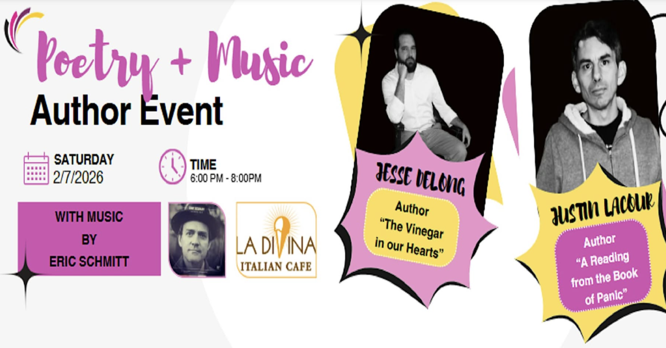 Join Authors Jesse DeLong and Justin Lacour for an evening weaving poetry with the music of local favorite Eric Schmitt. A Valentine Prequel Just in time for Valentine’s Day, this intimate evening blends spoken word and song in a soulful, moving experience. Featuring poetry from “The Vinegar in Our Hearts” by Jesse DeLong and excerpts from Justin Lacour’s “A Reading from the Book of Panic”, woven seamlessly with live music by beloved local singer-songwriter Eric Schmitt. Come celebrate love, longing, and the beautifully complicated heart. �� Books will be available for purchase and signing.