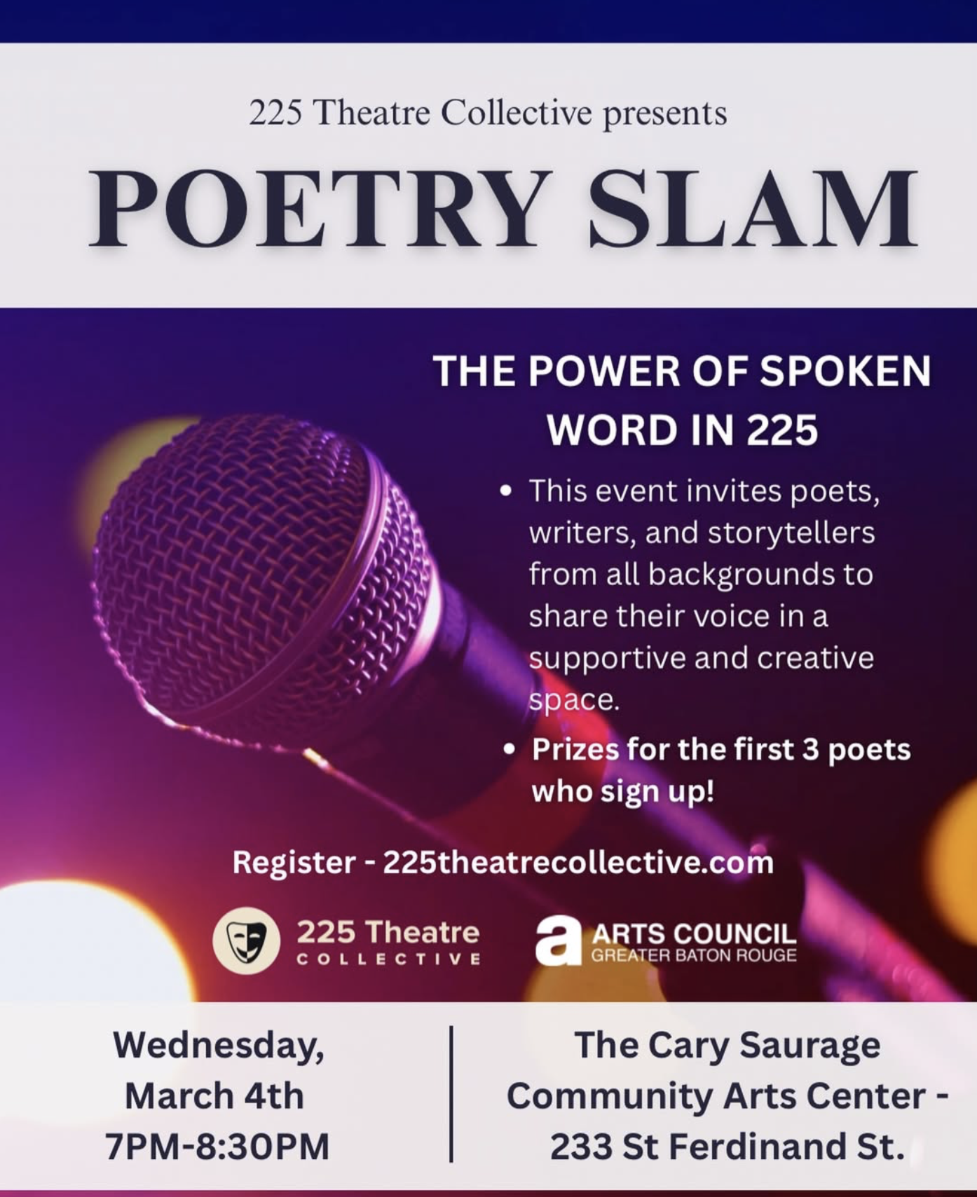 233 St Ferdinand St, Baton RougeWe are back March 4th! Join 225 Theatre Collective for another powerful night of spoken word, creativity, and community at our Poetry Slam. Poets, writers, and storytellers of all backgrounds are invited to take the stage and share their voice in a supportive, high-energy space. Sign up or get your tickets at 225theatrecollective.com