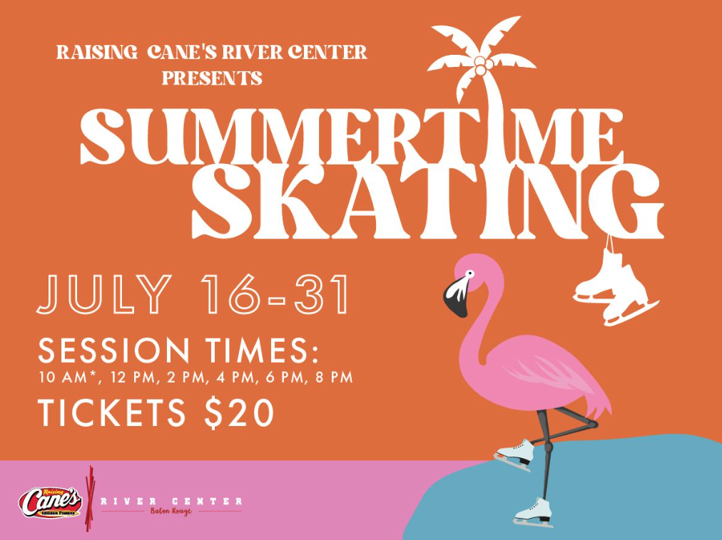 Beat the Louisiana heat with some Summertime Ice Skating! The Raising Cane’s River Center is bringing its cherished public ice skating to the summertime to help Baton Rouge cool down kicking off on July 16, 2022. Summertime Skating will feature 75 minute sessions every day from July 16, 2022 until July 31, 2022. Session Times Sunday - 12:00 PM, 2:00 PM, 4:00 PM, 6:00 PM, 8:00 PM Monday-Saturday - 10:00 AM, 12:00 PM, 2:00 PM, 4:00 PM, 6:00 PM, 8:00 PM Location Summertime Skating will take place in the Arena. Raising Cane's River Center Portal A (next to River Road Box Office) 275 S River Road Baton Rouge, LA 70802 Downtown Baton Rouge Tickets Tickets for this event will be $20 for all ages, with the exception of carried infants. Paid admission is required for all skaters. Spectators do not need to purchase a ticket, but will need to go through security. Tickets available on Ticketmaster.com or at the River Center Box Office on River Road. Tickets are only valid for the session you purchase them for. Group Pricing Groups of 10-19 paid skaters - $15 per ticket Groups of 20-49 paid skaters - $14 per ticket Groups of 50+ paid skaters - $13 per ticket Group tickets can be purchased on Ticketmaster.com or at the River Center Box Office on River Road. For more FAQs, visit https://raisingcanesrivercenter.com/summertime-skating.