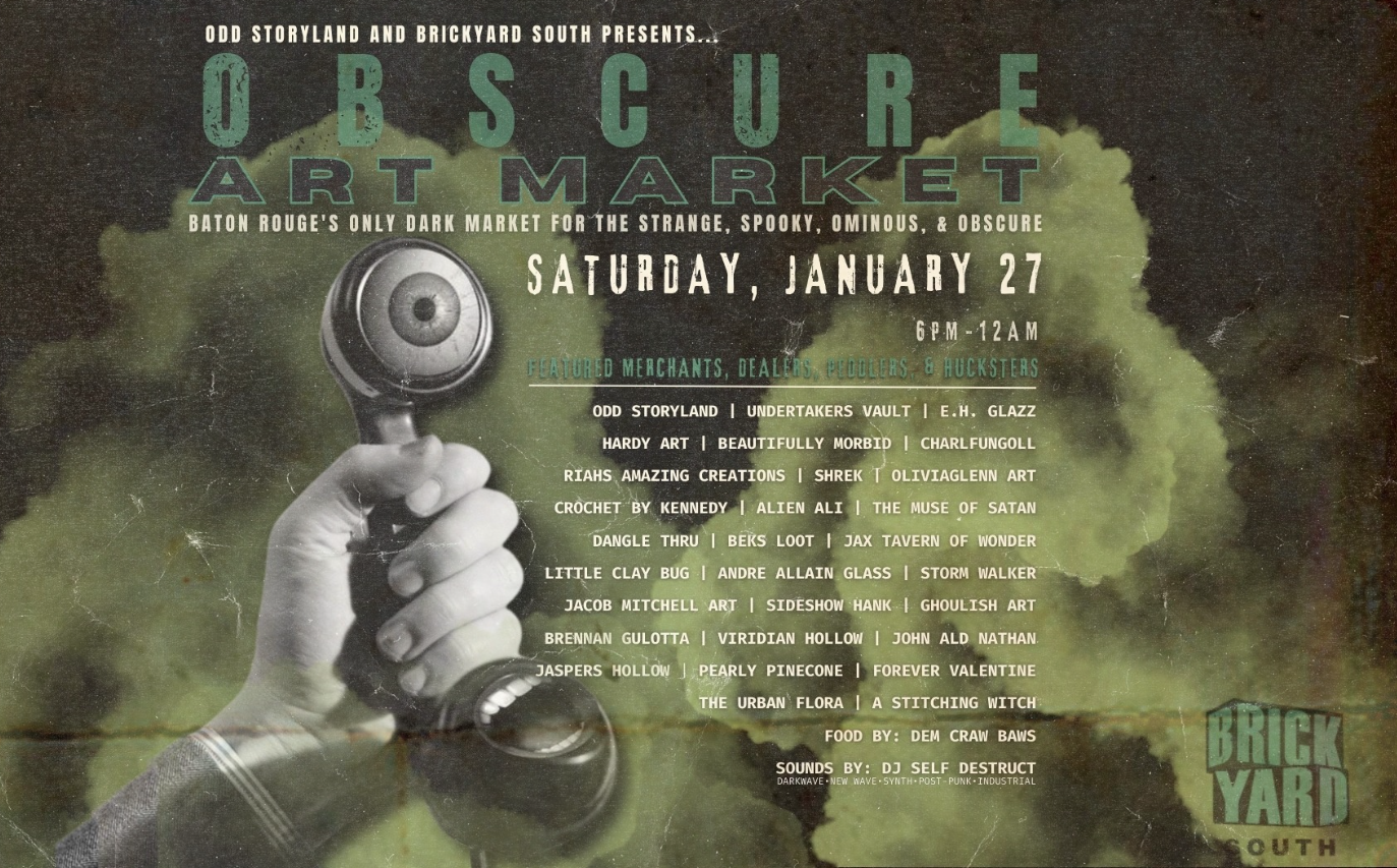 Mark your calendars for Saturday, January 27th, as we invite you to join us at Obscure Market @brickyardsouth_br, the one and only dark market in Baton Rouge. This unique pop-up event is a celebration of all things strange, spooky, ominous, and obscure. We've carefully curated a selection of vendors, dealers, artists, and small businesses from around the state, all of whom will be showcasing their weird, macabre, and obscure creations. What can you expect to find at Obscure Market? Well, the list is delightfully peculiar: taxidermy, preserved specimens, peculiar paintings and sculptures, horror and Halloween-inspired artworks, antiques, handcrafted oddities, homemade candles, creepy clothing, unique jewelry, animal skulls and bones, intricate embroidery, mesmerizing blown glass, and so much more. There's truly something strange here for everyone! Beyond the extraordinary wares on display, Obscure Market is your chance to support local small businesses, artists, and artisans. With an impressive lineup of 40+ vendors, this will (once again) be our largest market to date. So, don't miss out on the opportunity to get weird with us and dive into the world of the obscure. LIST OF VENDORS BELOW Odd storyland Undertakers Vault E.h. glazz Hardy Art Beautifully Morbid Riahs amazing creations Charlfungoll Sideshow Hank Crochet by Kennedy Oliviaglenn Art The Muse of Satan Dangle Thru Beks Loot Jax Tavern of Wonder Little Clay Bug Andre Allain Glass Storm Walker Jacob Mitchell Art Shrek Ghoulish Art Brennan Gulotta Viridian Hollow John Ald Nathan Jaspers Hollow Pearly Pinecone Forever valentine Alien Ali The Urban Flora A Stitching Witch Food by: Dem Craw Baws Music by: DJ Self Destruct